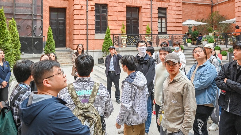 免费成人网站师生在巴公房子中庭听肖伟会长讲述修缮设计过程