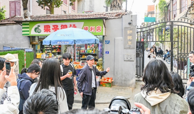 最后,师生们来到充满生活气息的同兴里。这条始建于1928年的里弄,由当时的银行家集资兴建,是汉口保存最完好的里分建筑群之一。漫步在狭窄的巷弄中,肖会长为同学们详细讲解了里分建筑的形制特征:“大家注意观察这些建筑的门楣装饰,既有欧式纹样,又有传统中式元素,体现了汉口多元文化的交融。建筑采用砖木结构,外墙为清水红砖,内部则保留了传统天井院落的空间格局。”同时,建规系老师们也对同学们指出历史街区“活态保护”的重要性,“同兴里的成功之处在于,它不仅是建筑实体的保护,更是生活方式的延续。这里的咖啡馆、手作店与居民日常生活和谐共存,形成了独特的社区生态。”这种保护理念让同学们深受启发。