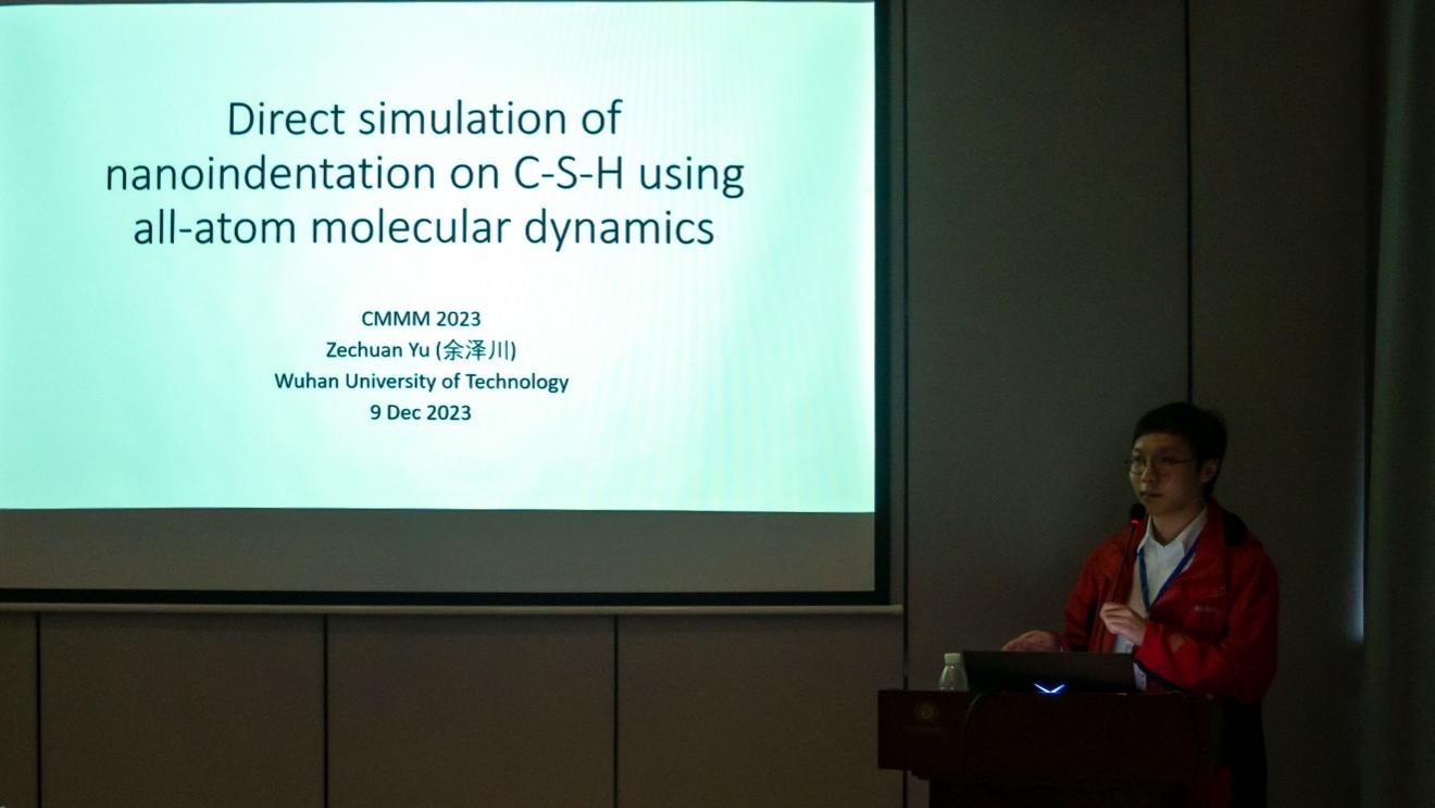 2023年12月8-10日,第五届力学和材料建模计算国际会议(CMMM2023)在广西南宁举行,免费成人网站 青年教师余泽川博士在MS04分会场作报告,分会场主题为:先进混凝土材料和结构的多尺度建模方法(Multiscale Modeling of Advanced Concrete Materials and Structures),余泽川博士报告主题为:基于全原子分子动力学模拟水化硅酸钙的纳米压痕试验(Direct simulation of nanoindentation on C-S-H using all-atom molecular dynamics simulations)。