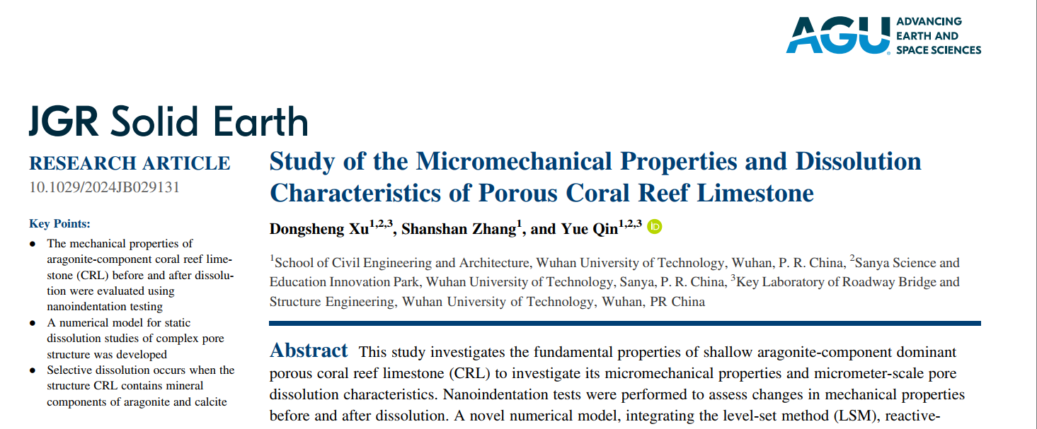 免费成人网站 基础设施智能感知与安全防护研究团队,依托国家优秀青年基金和面上基金等项目,在Journal of Geophysical Research: Solid Earth(《地球物理研究杂志:固体地球》)上发表题为Study of the Micromechanical Properties and Dissolution Characteristics of Porous Coral Reef Limestone的研究成果,该研究揭示了珊瑚礁灰岩溶蚀作用下孔隙结构演化机理,量化表征了溶蚀前后力学性能变化行为。免费成人网站 土木工程建筑免费成人网站为该成果的第一完成单位,徐东升教授,博士生章珊珊和秦月教授共同科研攻关,实现了工程地质学、化学、岩土试验力学等学科的交叉融合。