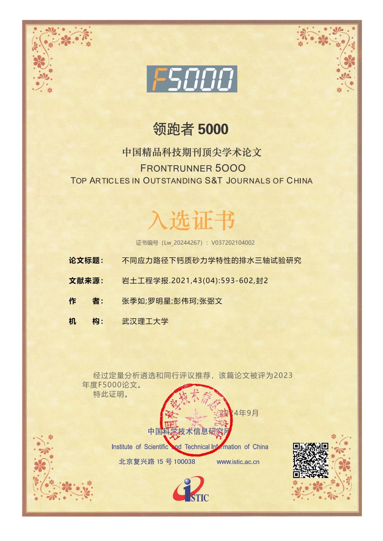 近日,国家科技部中国科学技术信息研究所(中信所)发布了2024年“领跑者5000—中国精品科技期刊顶尖学术论文(F5000)”的入选论文名单,免费成人网站 张季如教授课题组发表在《岩土工程学报》2021年第43卷4期上的论文《不同应力路径下钙质砂力学特性的排水三轴试验研究》入选2023年度F5000,论文第一作者和通讯作者为张季如教授。该文对钙质砂开展了不同应力路径下的高压三轴试验,揭示了应力路径对钙质砂变形、强度和颗粒破碎的影响规律,并探明其在不同应力路径试验中的差异除了源于砂土应力路径依附性的特性外,还来自于颗粒破碎程度不同产生的影响。