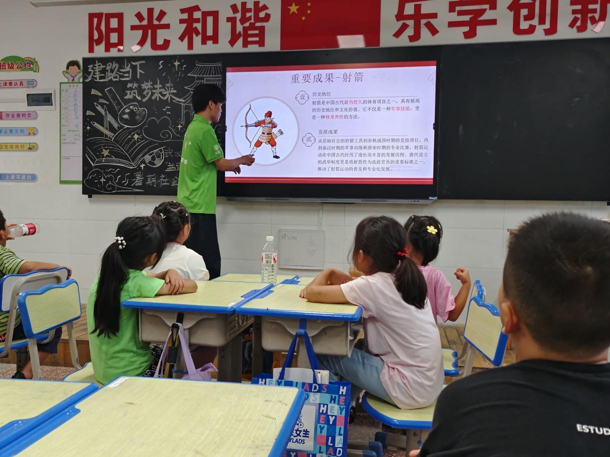 “中华文化源远流长、历史悠久,体育运动是其中重要的一部分”,活动伊始,实践队员们化身为历史的讲解者,以时间为轴,缓缓展开一幅幅古代传统运动的壮丽画卷。从远古时期的狩猎与舞蹈,到夏商周时期的射箭与驾车,再到蹴鞠的兴起、马球的驰骋、武术的博大精深,每一个传统运动项目都承载着深厚的文化底蕴和民族精神。学生们听得津津有味,仿佛置身于那个充满活力与智慧的古代世界,感受传统运动的独特韵味。