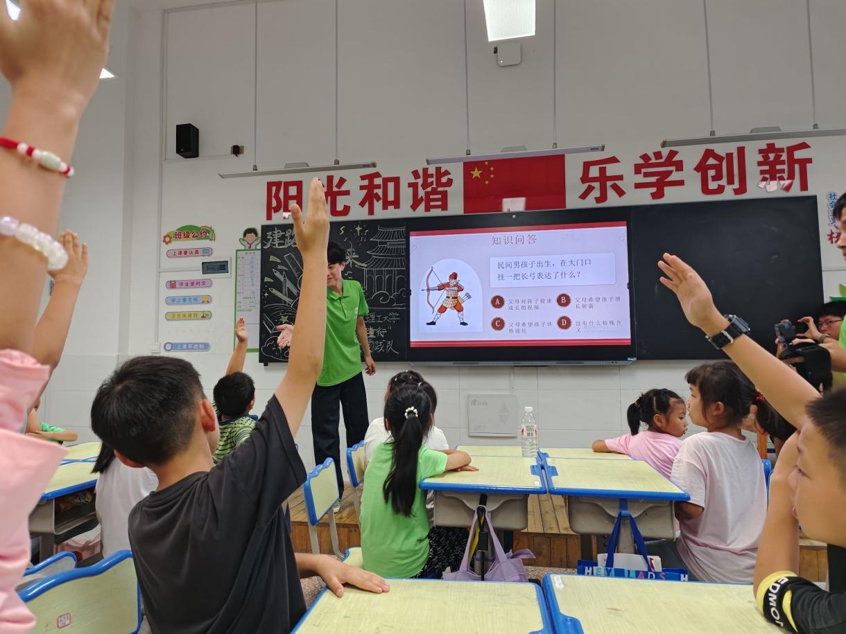 “龙舟运动中,谁是龙舟队的总指挥?”“民间男孩子出生,在大门口挂一把长弓表达了什么?”……面对这些问题孩子们或低头沉思或相互讨论或自信满满地举手抢答。现场气氛热烈而活跃充满了欢声笑语。实践队员们则根据孩子们的表现,给予及时反馈和鼓励以此激发他们的学习动力和潜能。