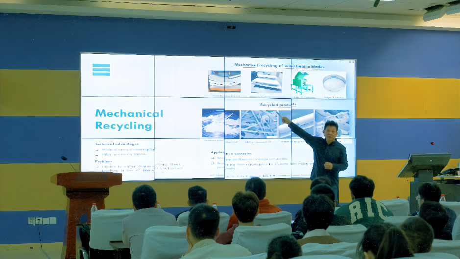刘锦茂院士在报告中系统阐述了当前清洁能源发展的最新进展及其伴生问题。他指出,随着全球风电产业的迅猛发展,风力发电机叶片的大量退役已成为制约行业可持续发展的突出挑战。其中,废弃叶片中所含的碳纤维如何实现高效、低碳、可持续的循环利用,是当前风电产业可持续发展的重要研究方向。针对这一问题,刘院士课题组开展了系统而深入的研究,结合实验与数值模拟手段,提出了多种创新性的纤维循环利用方案。这些方案在显著降低碳排放量的同时,大幅提升了资源利用效率和经济效益。课题组通过对比传统纤维生产方式的碳排放水平,验证了其循环再利用方案在绿色低碳方面的显著优势。